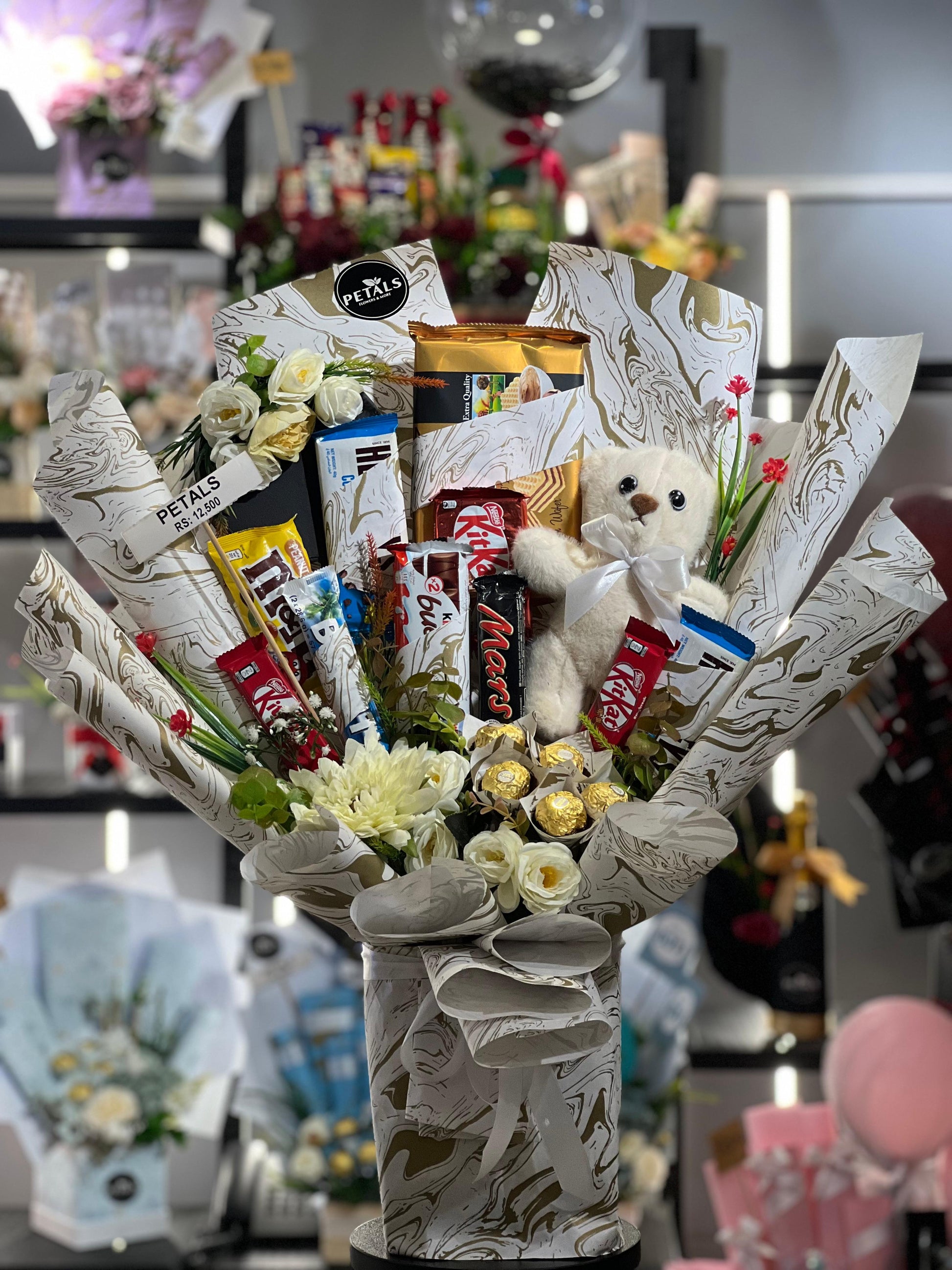 Chocolate Heaven Is featuring various types of Imported Chocolates and different types of Candies displayed in a Bouquet in a very unique design of paper making it a perfect gift for chocolate loves.
