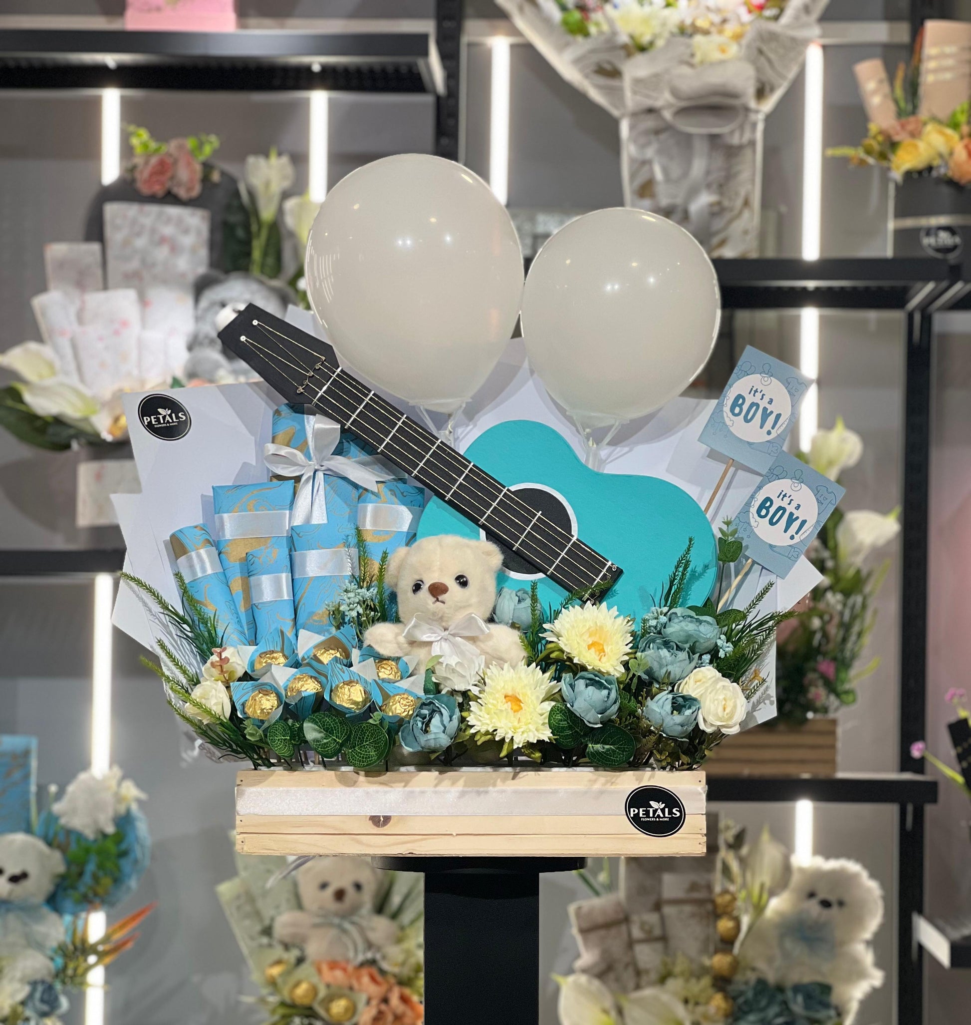 Congrats its Boy, it is a Gift Basket featuring Balloons, a cuddly bear, cards, lots of Imported Chocolates, Cardboard Guitar and a Wooden basket, perfect for celebrating a Baby Boy.