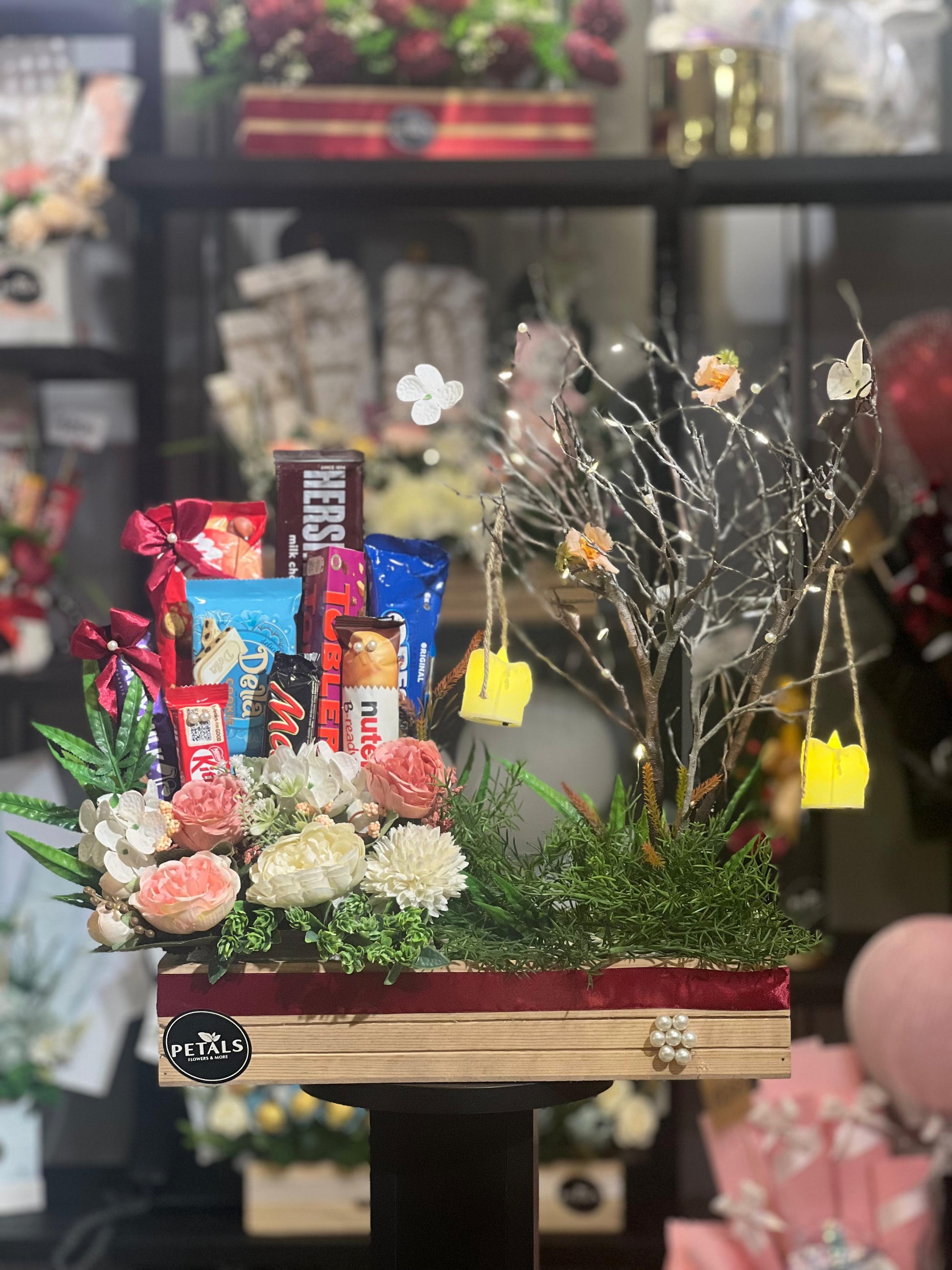 Garden of Eaten is featuring lots of imported chocolates, a tree like structure with light lamps, with some artificial grass and artificial flowers all displayed very nicely making it a perfect gift for many occasions.