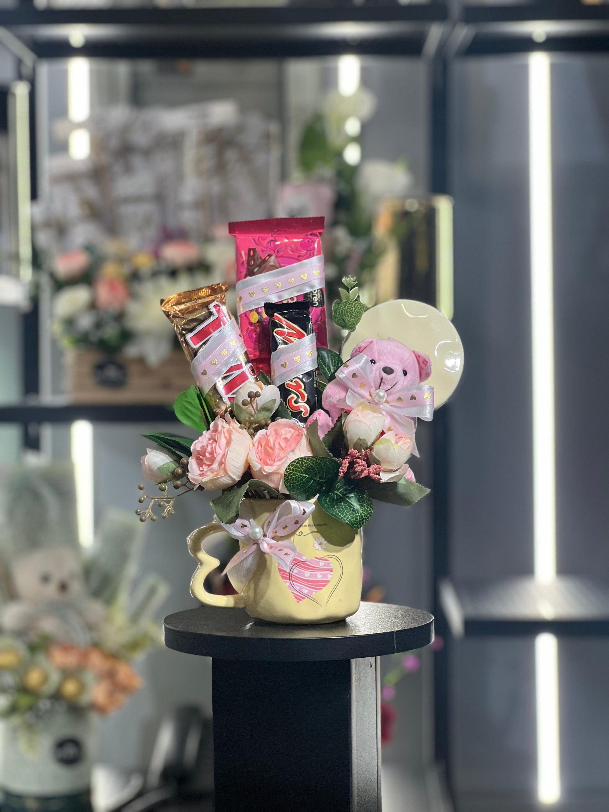 Lovely Mug is featuring some Imported chocolates, a handy Teddy bear, arranged in a cute Love mug with artificial flowers.